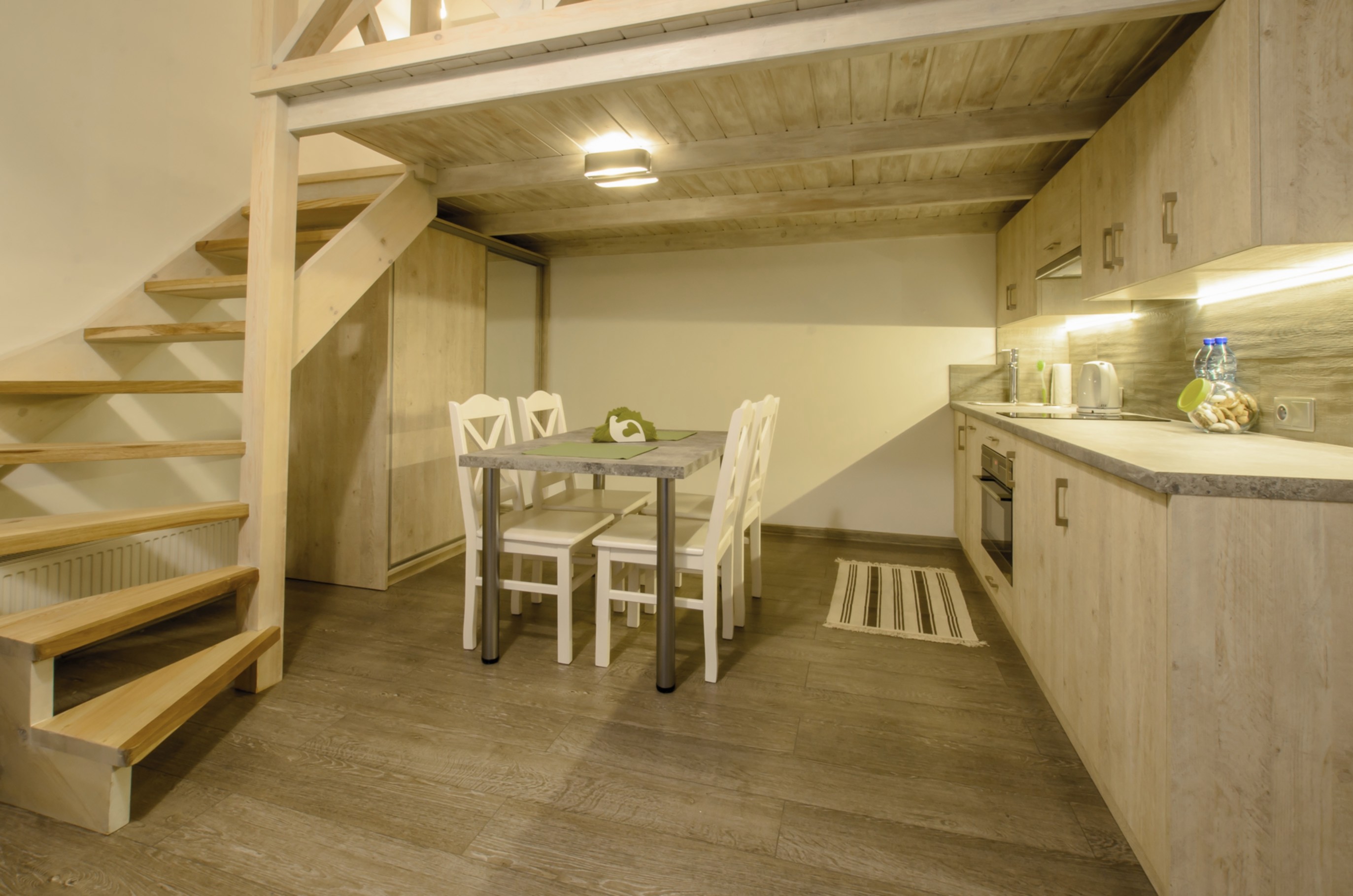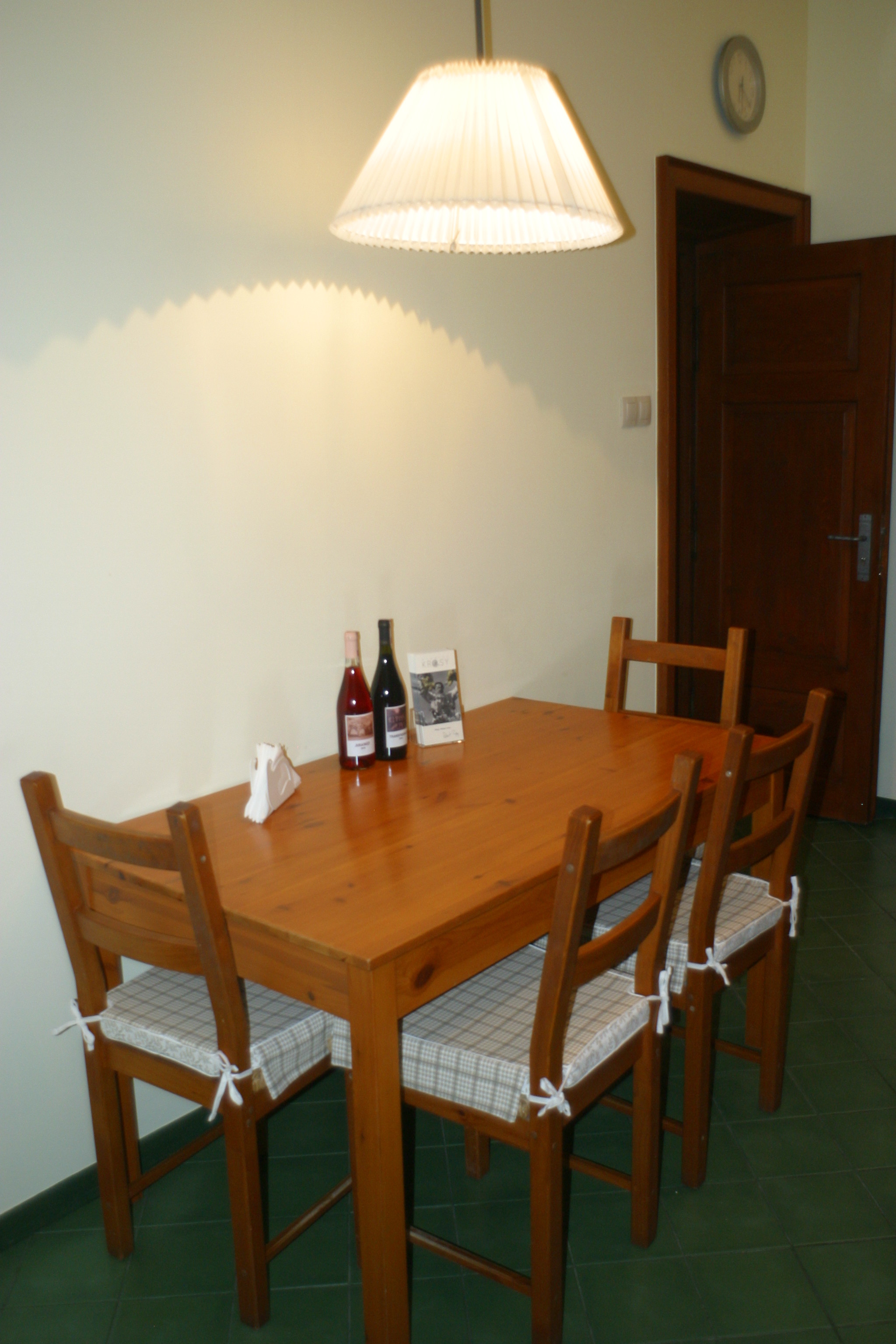 Pokój z antresolą , dwa podwójne łóżka w jednym pomieszczeniu. Oprócz tego łazienka z wanną, umywalką i toaletą, kuchnia z dużym stołem dla 4 osób, kompletnie wyposażona. Przedpokój, telewizor, radio, cd, Internet. Zlokalizowane na I piętrze cichej oficyny.